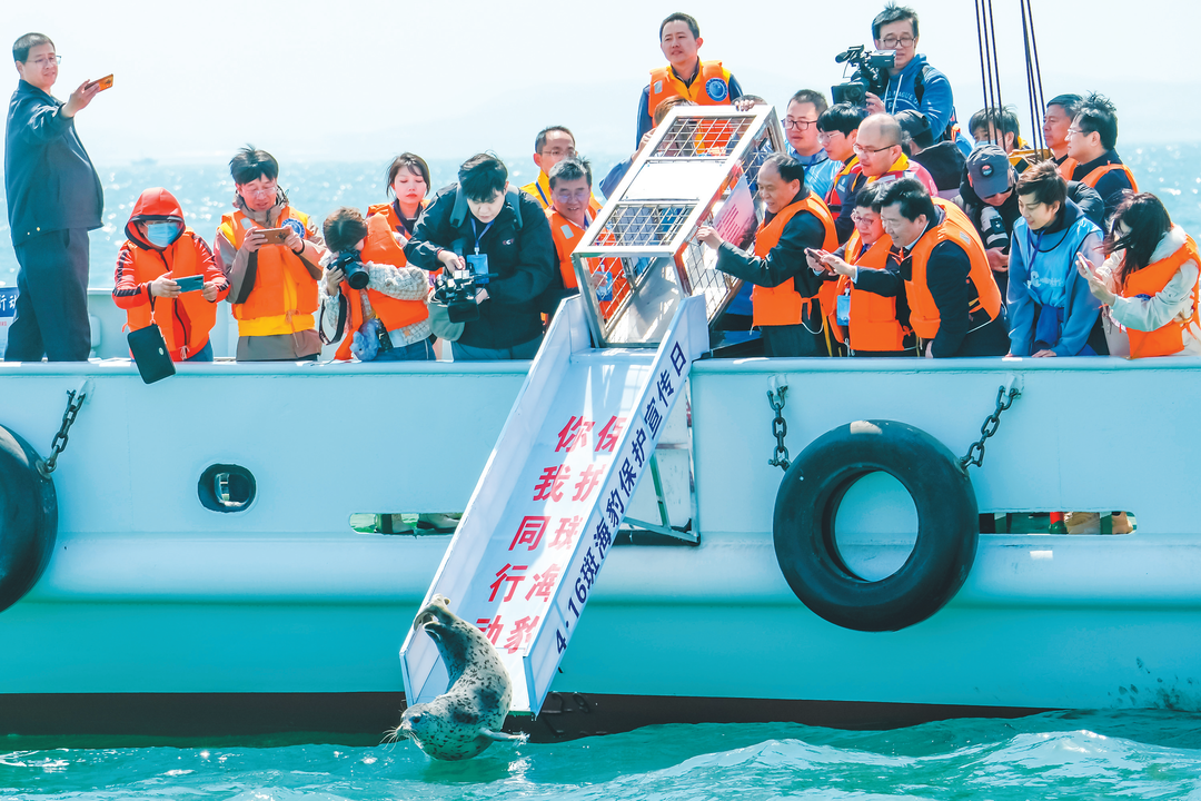 4月16日,斑海豹保护宣传日当天,7头斑海豹在旅顺海域被放归大海。