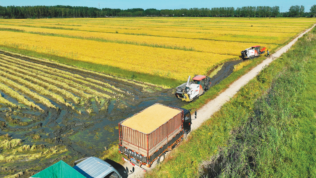 9月18日,在盘锦市大洼区西安镇高坎村的一片金色稻田里,两台水稻收割机正在作业。