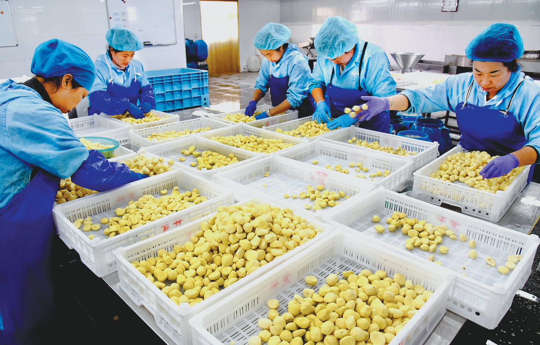 11月17日,丹东市振安区汤山城镇龙升板栗加工厂内一派繁忙景象,工人在生产线加工板栗。