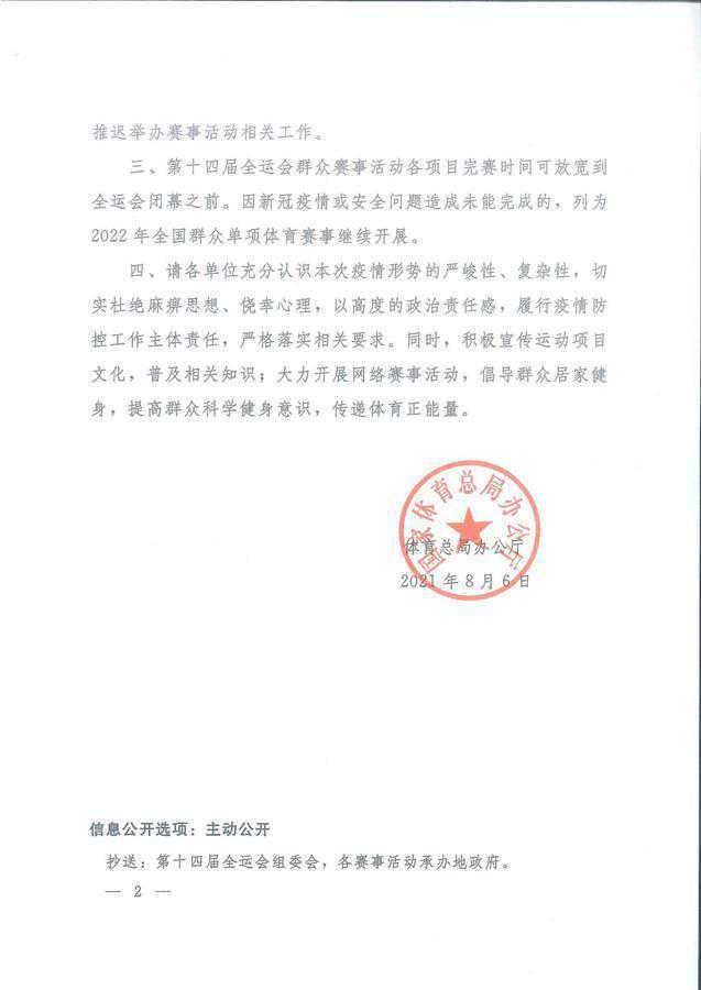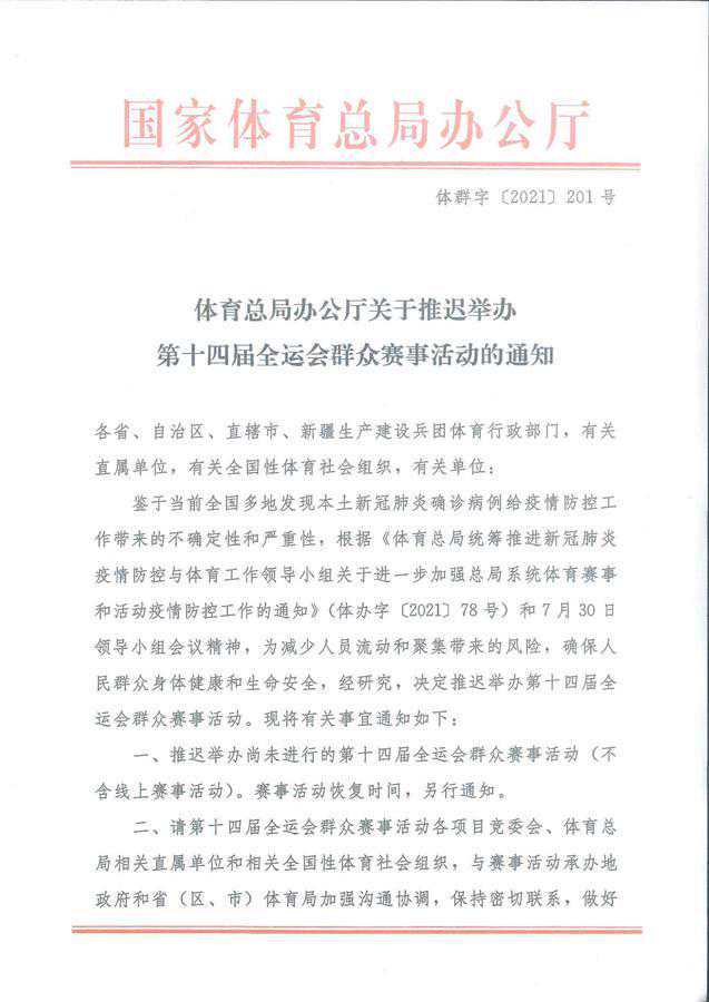 8月6日,国家体育总局办公厅发布了《关于推迟举办第十四届全运会群众赛事活动的通知》,称鉴于当前全国多地发现本土新冠肺炎确诊病例给疫情防控工作带来的不确定性和严重性,为减少人员流动和聚集带来的风险,确保人民群众身体健康和生命安全,经研究,决定推迟举办第十四届全运会群众赛事活动,恢复时间另行通知。因新冠疫情或安全问题造成未能完成的项目,列入2022年全国群众单项体育赛事继续开展。