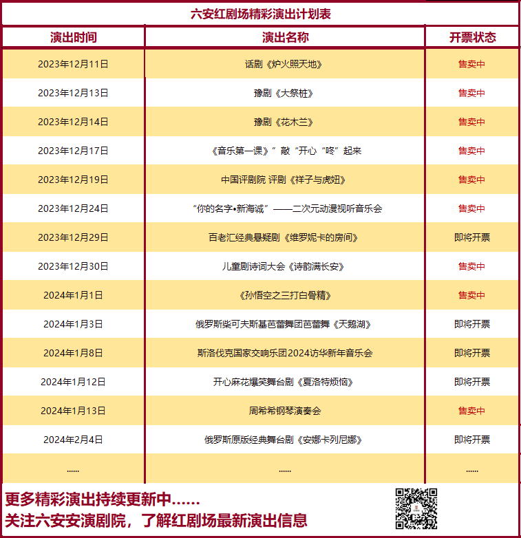 “徽班”登台,鸣锣开戏!2023年11月至2024年1月,中共安徽省委宣传部、安徽省文化和旅游厅、安徽省文学艺术界联合会主办“新时代新徽班新气象”安徽省精品剧目展演。12台大戏、21场演出,将精彩亮相于北京、上海、南京、杭州、合肥、六安等地。