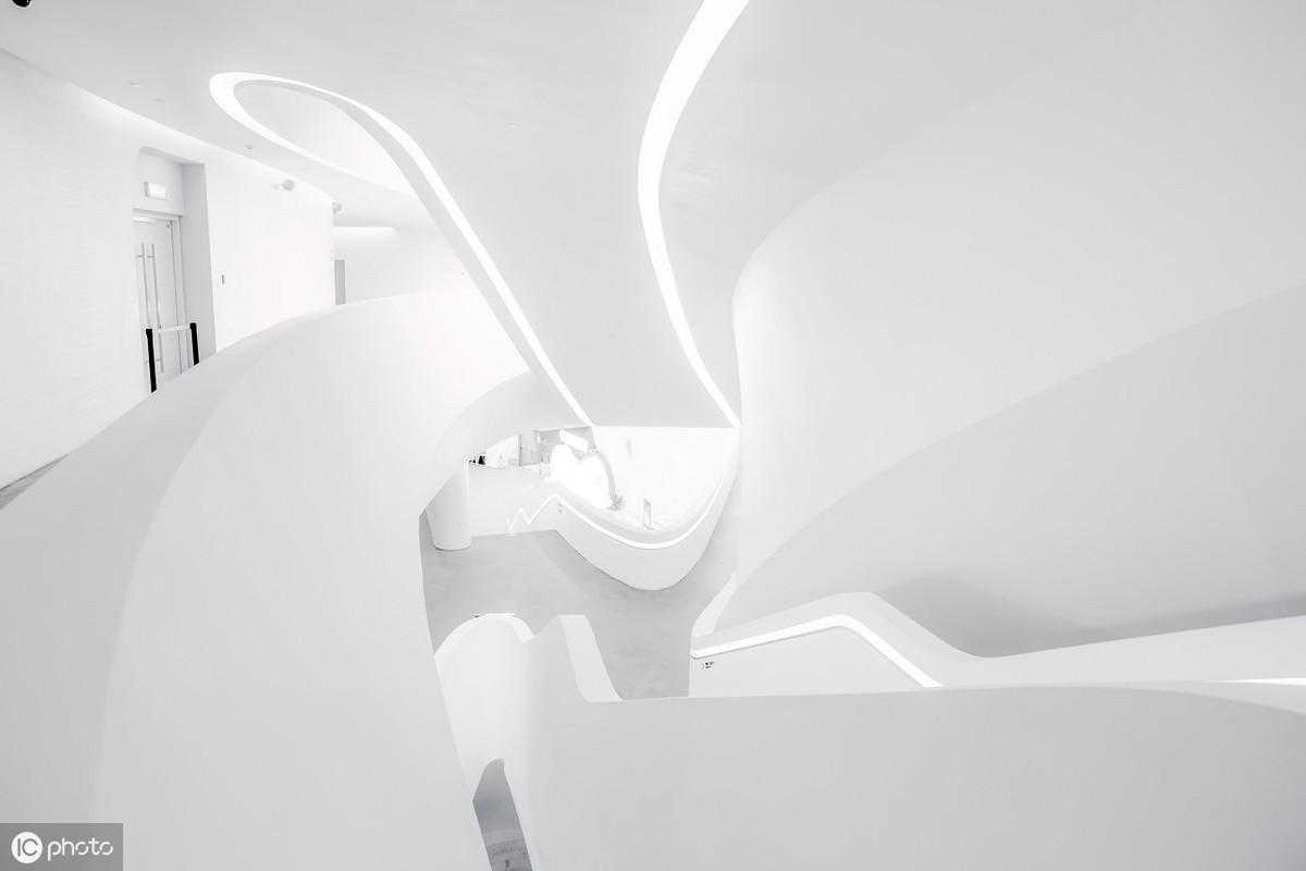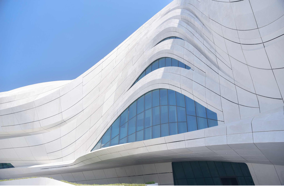 其极具辨识度的白色流动性立面下,是巨大的曲面玻璃幕墙。整个建筑坐落在阶梯状的的场地上,与周围的环境相融合。