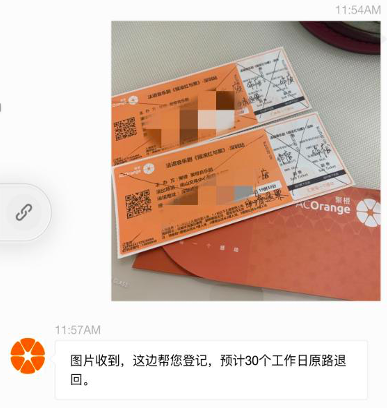 8月8日,严小姐按照要求上传照片后,客服承诺30个工作日完成退款,但截至目前,仍未收到聚橙平台的退款,“后续再次联系客服,给出的回复都是让我们再等等,一直拖着没有给出具体的退票时间”。