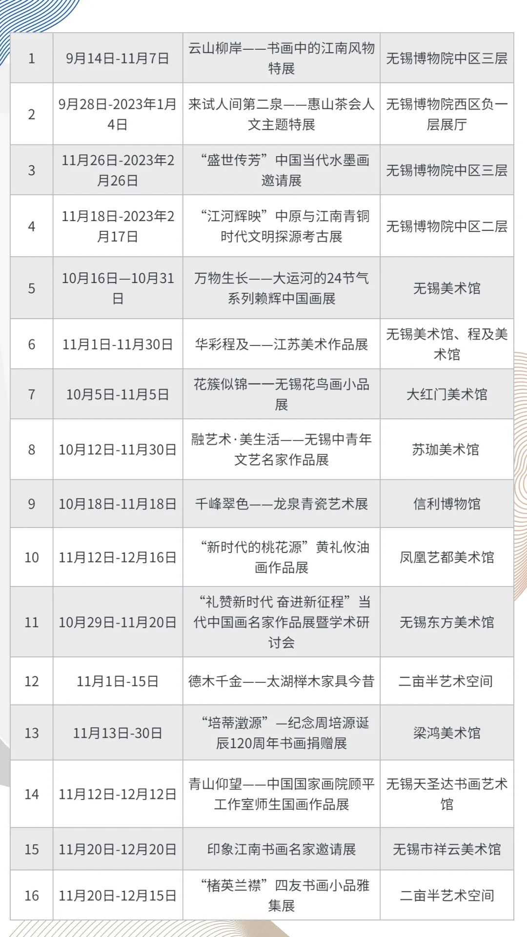 艺术季期间全市10余家文化场馆将持续展开各具特色的展览展示活动,包括文物展、摄影展、光影艺术装置展、美术展、书法展、工艺美术展等,充分体现社会各界参与文化建设的热情。